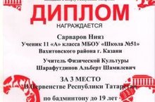 Поздравляем ученика 11 класса Сарварова Н., занявшего 3 место в первенстве Республики Татарстан по бадминтону. Молодец!!!