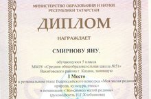 Поздравляем учителя Хлебникову Н.Г. и Смирнову Яну за 1 место в региональном этапе Всероссийского конкурса "Моя малая родина:культура, природа, этнос" в номинации "Эко-символ малой родины"!. Желаем дальнейших успехов, мы гордимся Вами!!