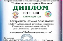 Воспитанник старшей группы Кагарманов Ильхам Адалятович,участвовал Межрегиональном заочном конкурсе детского творчество "Любимые сказки народов Поволжья".Награжден дипломам 1 степени.