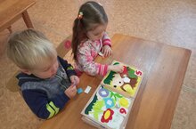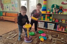 Цель: закреплять у детей умение устанавливать соотношение между несколькими предметами по величине при собирании пирамидки.