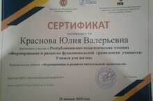 25 января учитель русского языка и литературы Краснова Юлия Валерьевна приняла участие в 1 Республиканских педагогических чтениях по теме: "Формирование и развитие функциональнойграмотности учащихся: учимся для жизни ", на которых выступила с докладом и отмечена сертификатом участника. Всего в конференции приняло участие около 190 учителей со всей нашей республики