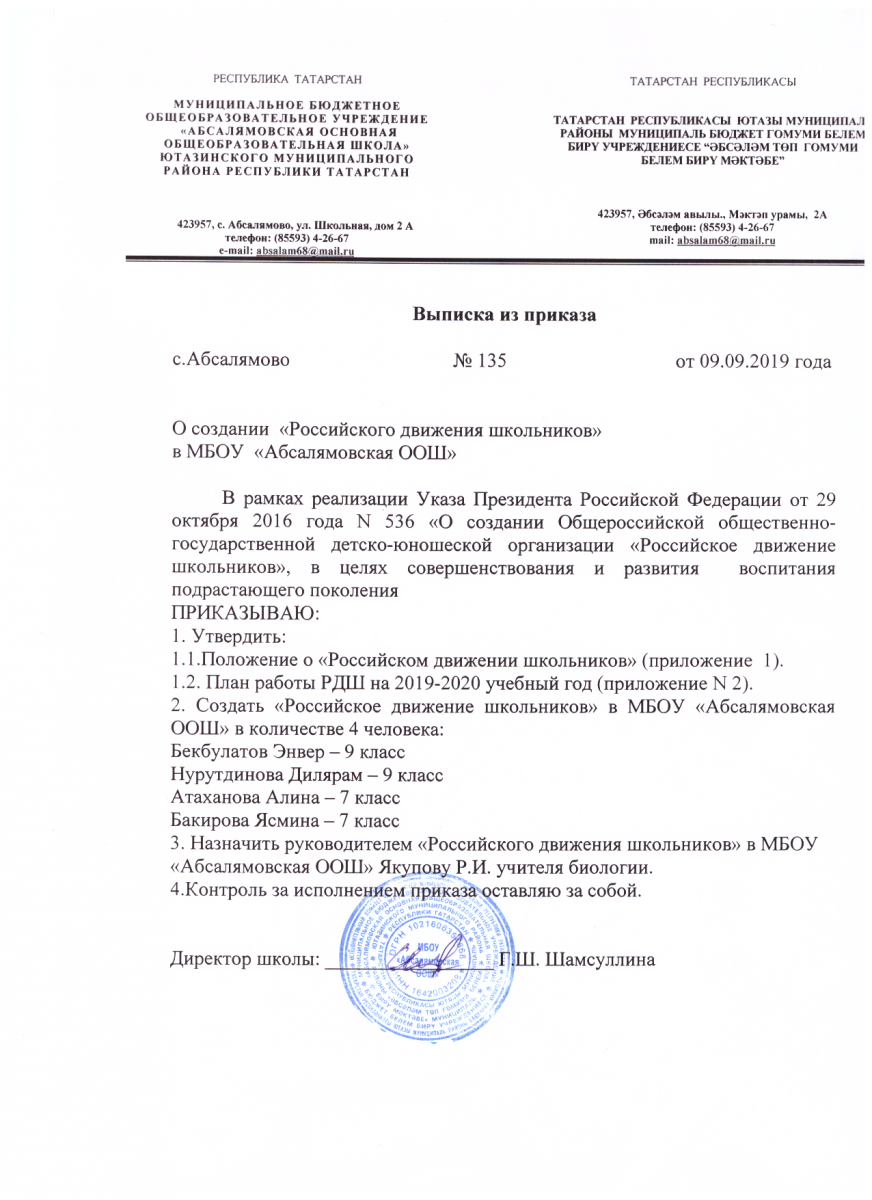 Приказ о создании РДШ на 2019-2020 учебный год