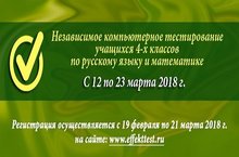 Независимое компьютерное тестирование школьников 4-х классов по русскому языку и математике проводится в период с 12 по 23 марта 2018 года.Регистрация ОУ осуществляется с 19 февраля по 21 марта 2018 года на сайте www.effekttest.ru