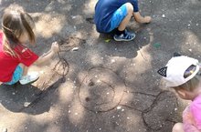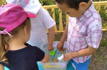 Детки поймали кузнечика и чтобы хорошо его рассмотреть посадили его в банку.