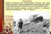 В рамках 75-летия разгрома советскими войсками немецко-фашистских войск в Курской битве на внеклассном мероприятии учащиеся 9-11 классов ознакомились с историей праздника. Вниманию учащихся была представлена презентация на тему «К 75-летию Курской битвы». Урок провела учитель истории Касимова С.Ш.
