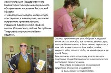 Ростов өлкәсенең картлар һәм инвалидлар йорт-интернатларында яшәүче сугыш һәм тыл ветераннарына җибәрелгән мәктәбебез укучыларының открыткалары һәм хатлары адресатларга барып җиткән. Алар безгә рәхмәт хатлары юлладылар.
