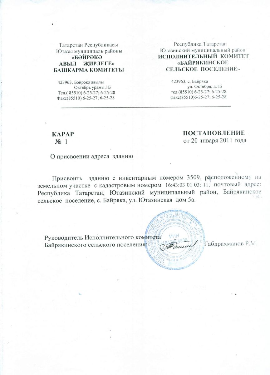 Адрес: 423963, Республика Татарстан, Ютазинский район, с. Байряка, ул. Ютазинская, д. 5А