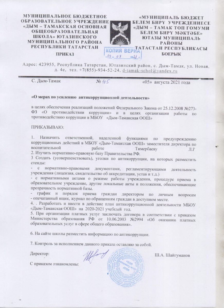 Приказ МБОУ "Дым-Тамакская ООШ" по антикоррупционной деятельности на 2020 -2021 учебный год