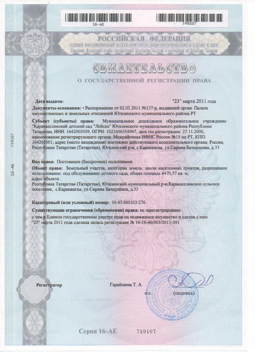 Короткое название: МБДОУ Каракашлинский детский сад "Лейсан"