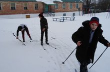 Сегодня воспитанники лагеря катаются на лыжах в школьном дворе.