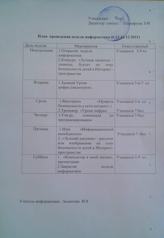План проведения недели информатики/ Информатика атналыгын үткәрү планы 06.12.2021