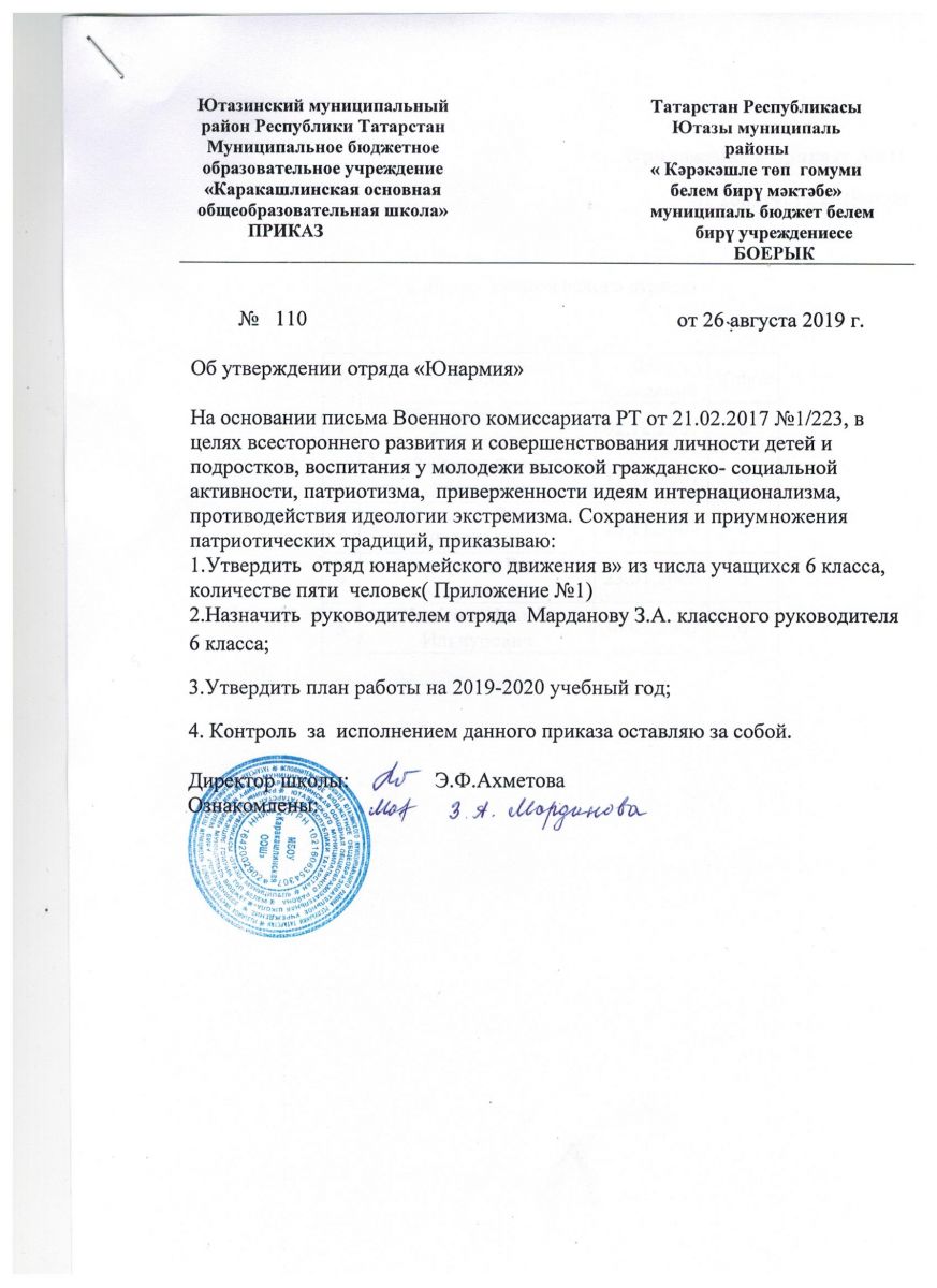 Приказ на 2019-2020 уч.год отряда Юнармия