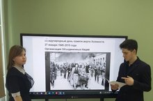 С учащимися 10 класса прошёл воспитател ный час на тему " Победившие смерть". Задача урока: познакомить с темой Холокоста как одним из примеров бесчеловечной политики нацистов, воспитывать уважительное отношение к окружающим людям, независимо от их национальности и конфессиональной принадлежности