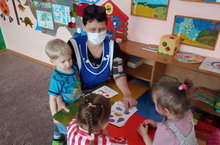 Младший воспитатель во время режимных моментов занимается с детьми младшей подгруппы. / Кече тәрбияче режим моментларында кече төркемчек балалары белән шөгыльләнә.