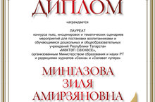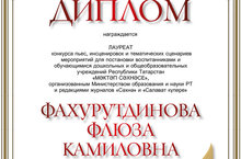 лауреат конкурса пьес, инсценировок и тематических сценариев мероприятий для постановки воспитанниками и обучающимися дошкольных и общеобразовательных учреждений РТ "Мәктәп сәхнәсе" организованным Министерством образования и науки РТ и редакциями журналов "Сәхнә" и "Салават күпере".