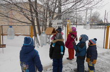 С 10 декабря начинается акция "Покормите птиц зимой". Родители вместе с детьми изготовили кормушки. Мы сегодня с детьми их повесили на деревья. В уголке для родителей выставили информацию по теме акции. В коридоре поставили пластиковый контейнер - "Копилка корм для птиц", для того , чтобы дети вместе с родителями время от времени пополняли кормом для птиц: пшеном, семечками, хлебными крошками.