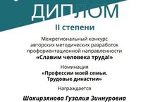 Учитель начальных классов Шакирзянова Гузалия Зиннуровна награждена дипломом 2 степени Межрегионального конкурса авторских методических разработок профориентационной направленности"Славим человека труда!" в номинации "Профессии моей семьи. Трудовые династии". Поздравляем и желаем дальнейших побед!