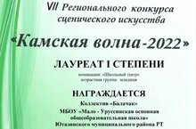 В декабре 2022 года учащиеся начальных классов МБОУ «Мало-Уруссинская ООШ» приняли участие в VII региональном конкурсе сценического искусства «Камская волна - 2022» и театральный коллектив “Балачак” стал победителем. Работа была отдельно отмечена жюри за соответствие критериям конкурса, высокое качество как технического, так и актерского мастерства. Поздравляем и желаем дальнейших успехов!