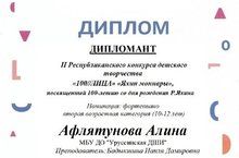 Поздравляем Афлятунову Алину и преподавателя Бадыкшину Наилю Дамировну со званием Дипломант в республиканском конкурсе "100/лица"Яхин моннары"г.Казань