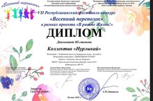 Коллектив«Нурлыкай» (МБОУ «Уруссинская НОШ 1») - стали Дипломантами 3 степени - VII Республиканского фестиваля-конкурса «ВЕСЕННИЙ ПЕРЕПОЛОХ» в рамках проекта «В ритме Жизни!»