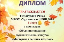 Ученик Гиззатуллин Риназ стал победителем конкурса "Мастерская осенних поделок" от ЦДТ в номинации "Объемные поделки". Пожелаем ему дальнейших успехов в творческом пути!