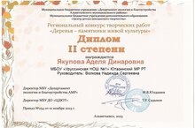 Ученица 4 Б класса - Якупова Аделя - приняла участие в региональном конкурсе творческих работ «Деревья - памятники живой культуры» и награждена дипломом 2 степени (педагог:Волкова Н.С.)