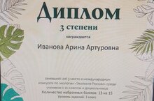 Ученица 3Б класса Иванова Арина приняла участие в Международном конкурсе по экологии "Экология России" среди учащихся 1-11 классов и заняла 3 место!
