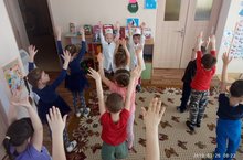 Следующая остановка называлась "Чистюлькино". Ребятня отгадывали загадки о гигиене и рассказывали для чего нужно соблюдать гигиену. На остановке "Закаляйкино", делали массаж(взаимомассаж)
