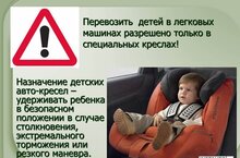 Согласно требованиям, несовершеннолетние пассажиры могут ехать только в салоне легкового либо в кабине грузового автомобиля (перевозка детей в кузове грузового автомобиля в прицепе запрещена). Также запрещена перевозка детей на заднем сидении мотоцикла. Нельзя перевозить детей на руках, поскольку в ситуациях, возникающих при столкновении, даже при небольшой скорости машины, вес маленького пассажира увеличивается в несколько раз, и удержать его на руках крайне сложно. Максимальную безопасность ребенка во время движения обеспечивает только автокресло. Поэтому не нарушайте правила, какими бы благими не казались ваши намерения.