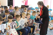 Сегодня состоялся тематический праздник ,посвященный Дню Победы.Перед дошкольниками выступила председатель общественной организации ветеранов Глушкова Зоя Васильевна. Она рассказала о нелегком детстве в военные годы и подарила ребятам Георгиевские ленты.