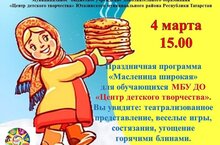 Не найти такого человека в России, который бы не любил этот праздник! Масленицу ждут не только взрослые, но и, с большим нетерпением, дети. Сегодня, 4 марта на территории МБУ ДО " Центр детского творчества" детская студия "Юные таланты" выступала на празднике встречи весны "Масленица широкая". Зрители увидели настоящее представление сказочных персонажей. Весёлые скоморохи приглашали детей и взрослых на яркий, весенний праздник. Зима с суровым характером не желала уходить. Весёлый дед и бабка подбадривали всех желая скорейшего прихода весны. Леший и забавная баба яга хитростью хотели отнять трон весны - красны. А в итоге победило добро! Весна пришла и всем подарила радость. С праздником всех поздравил директор МБУ ДО "Центр детского творчества" Гиззатуллина Р.А.Задорным танцем выступил хореографический коллектив "Сөембикә". Дети и взрослые принимали активное участие в играх. В заключение прощания с зимой все угощались горячими, пышными, вкусными блинами и танцевали в весёлом хороводе. Преп. Валиева Г. И. 14.03.2022