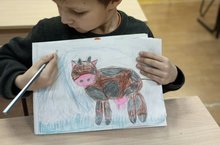 Объединение "Мозаика". Рисунок коровы. Каждый ученик сделал свой рогатый скот. У кого буйвол, у кого телёнок, у кого корова. Расскашивали карандашами, развивали аккуратность, усидчивость, силу нажима, как правильно держать карандаш. Педагог ДО Хафизова АК 15.01.2023