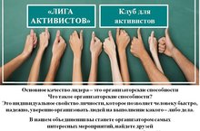 Если ты активен и полон креативнытых идей, тогда тебе точно к нам - "Лидер активистов". Основное качество лидера – это организаторские способности. Что такое организаторские способности? Это индивидуальное свойство личности, которое позволяет человеку быстро, надежно, уверенно организовать людей на выполнение какого – либо дела В нашем объединении ты станешь организатором самых интересных мероприятий, найдешь друзей и станете участником самых крупных событий! Мы находимся по адресу: пгт Уруссу, ул. Мияссарова, д.69. т. 2 81 09 26.09.2022