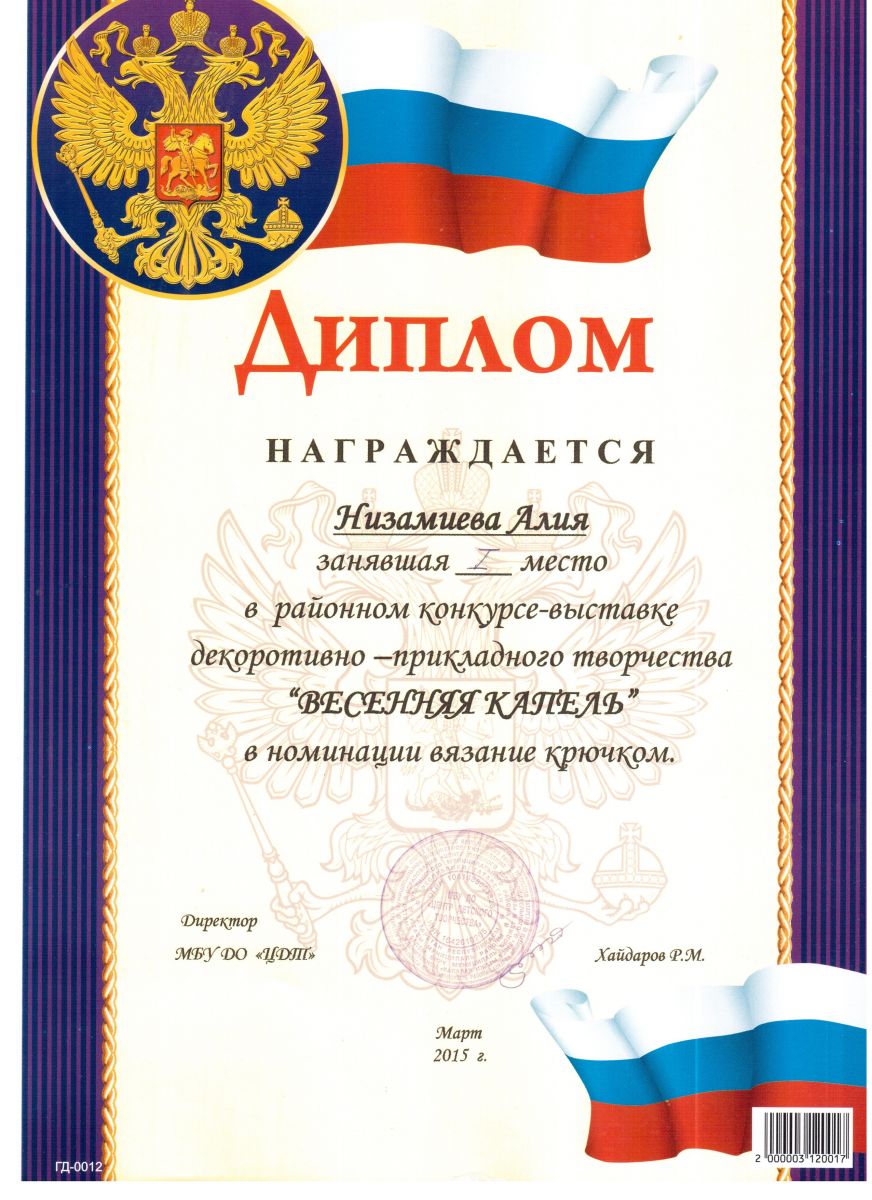 /Диплом 1 степени в районном конкурсе - выставке "Весенняя капель". Низамиева Алия.jpeg