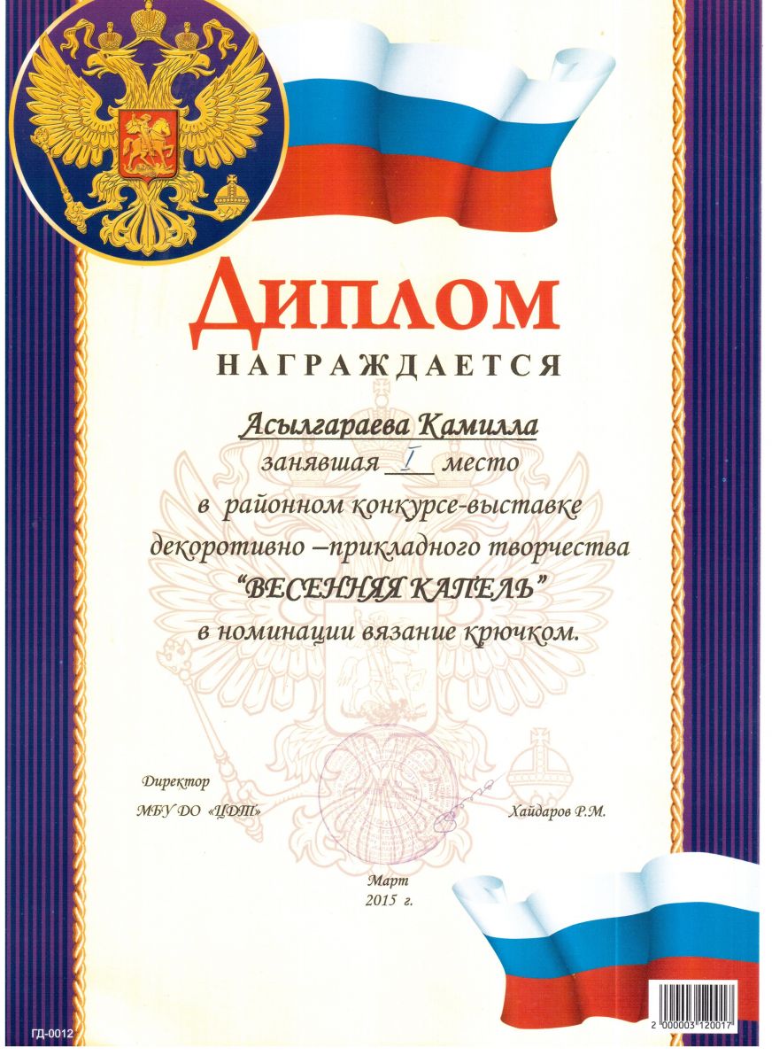 /Диплом 1 степени в районном конкурсе - выставке "Весенняя капель". Асылгараева Камилла.jpeg