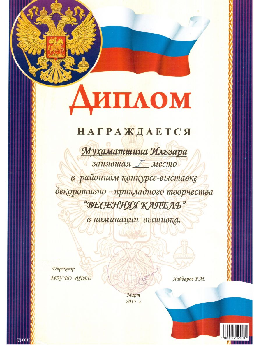 /Диплом 1 степени в районном конкурсе - выставке "Весенняя капель". Мухаматшина Ильзара.jpeg