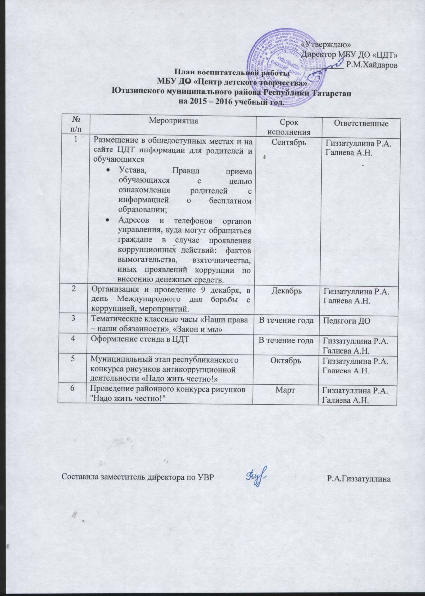 План воспитательной работы МБУ ДО "ЦДТ" по формированию антикоррупционного мировоззрения на 2015-2016 учебный год