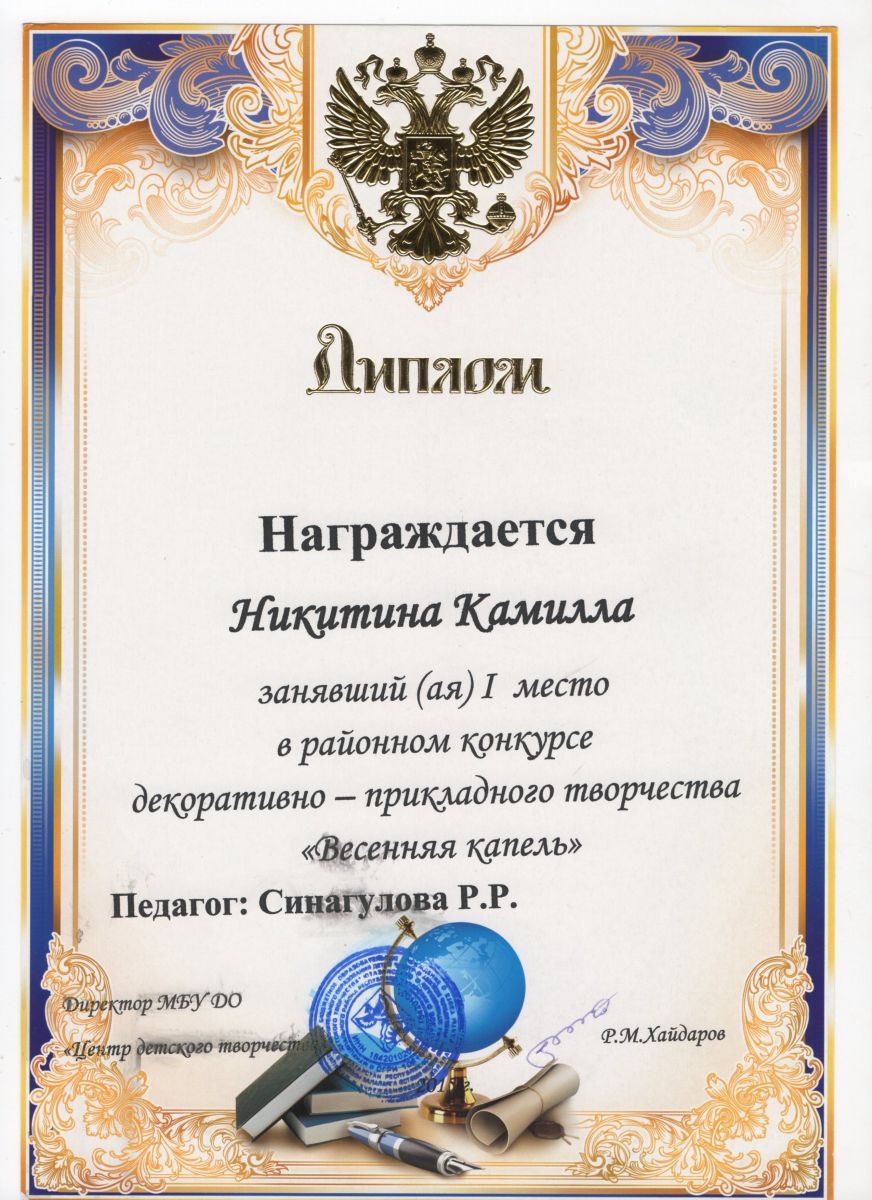 /Диплом 1 степени в районном конкурсе декоративно - прикладного творчества "Весенняя капель" (Никитина Камилла).jpg