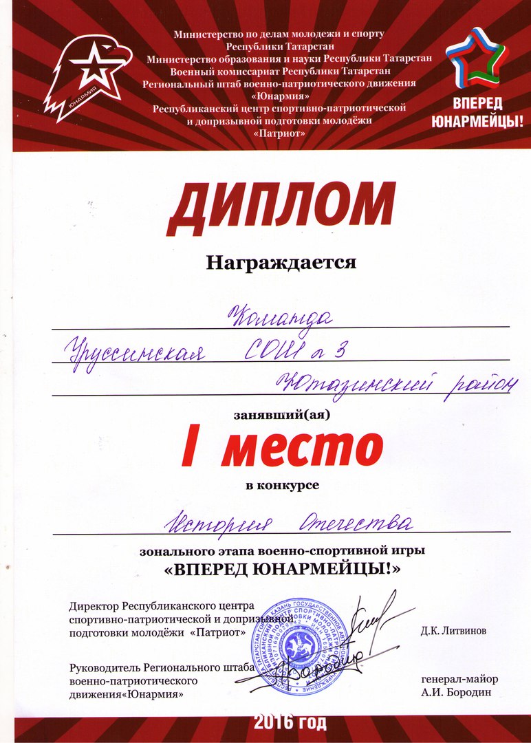 /Диплом I степени в зональном этапе военно- спортивной игры "Вперед юнармейцы" (Команда УСОШ №3).jpg