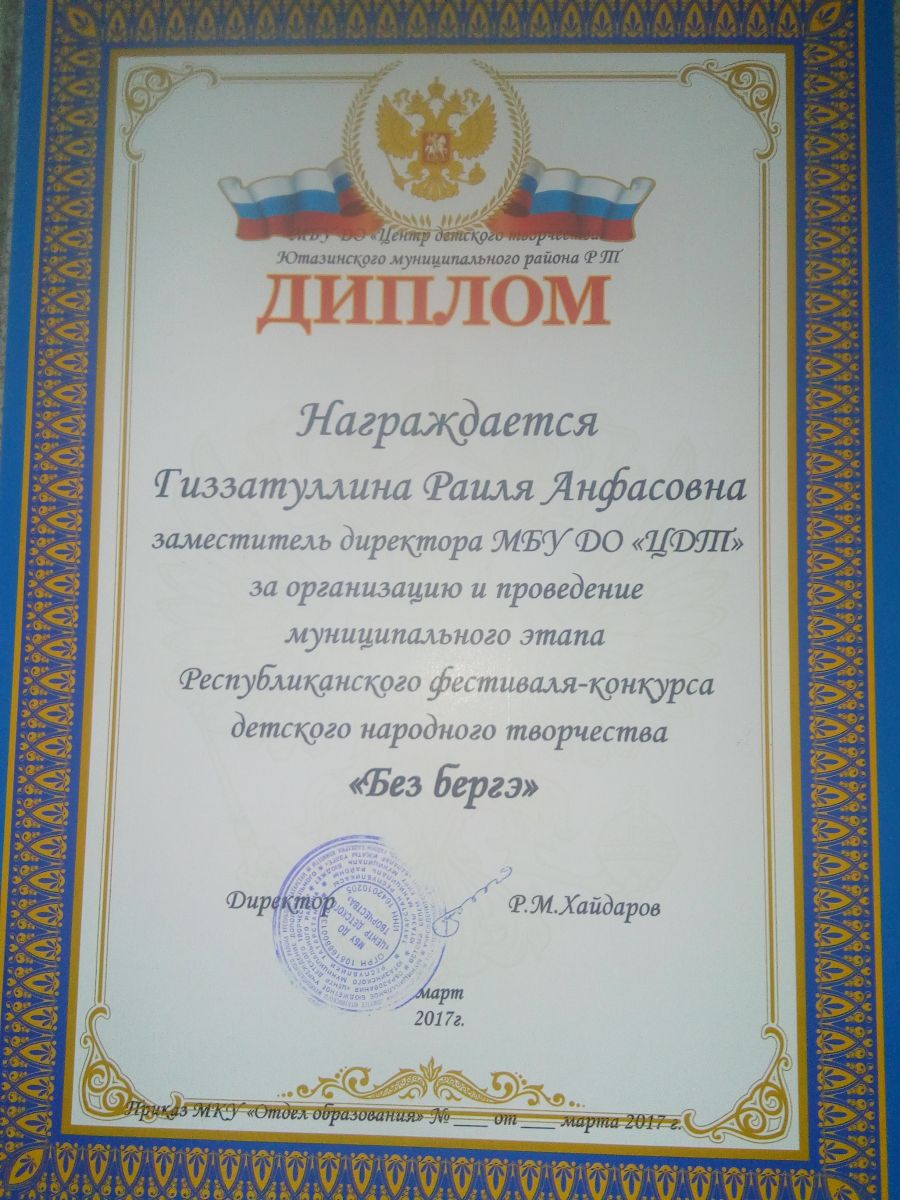 /Диплом за организацию и проведение муниципального этапа Республиканского фестиваля - конкурса детского народного творчества "Без бергэ".jpg