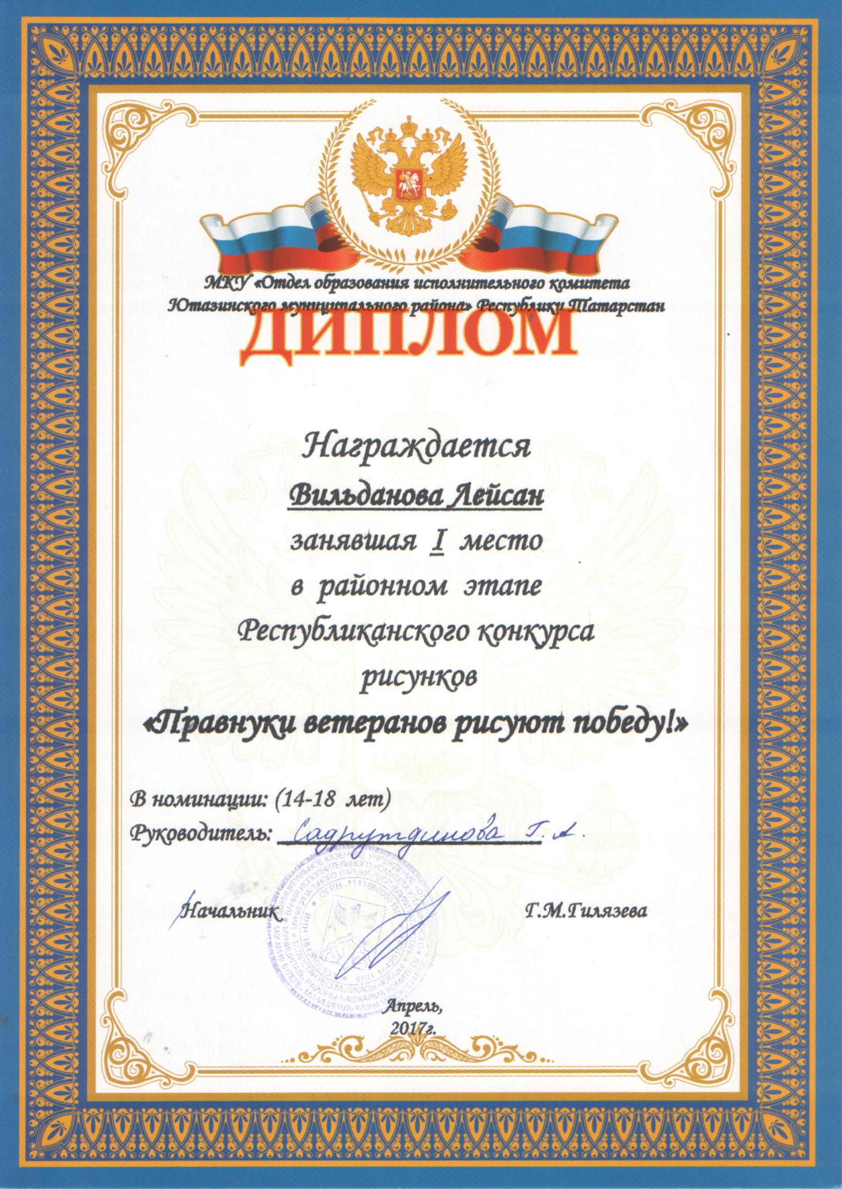/Диплом 1 степени в районном конкурсе сочинений "Отцы глазами детей".Вильданова Лейсан.pdf