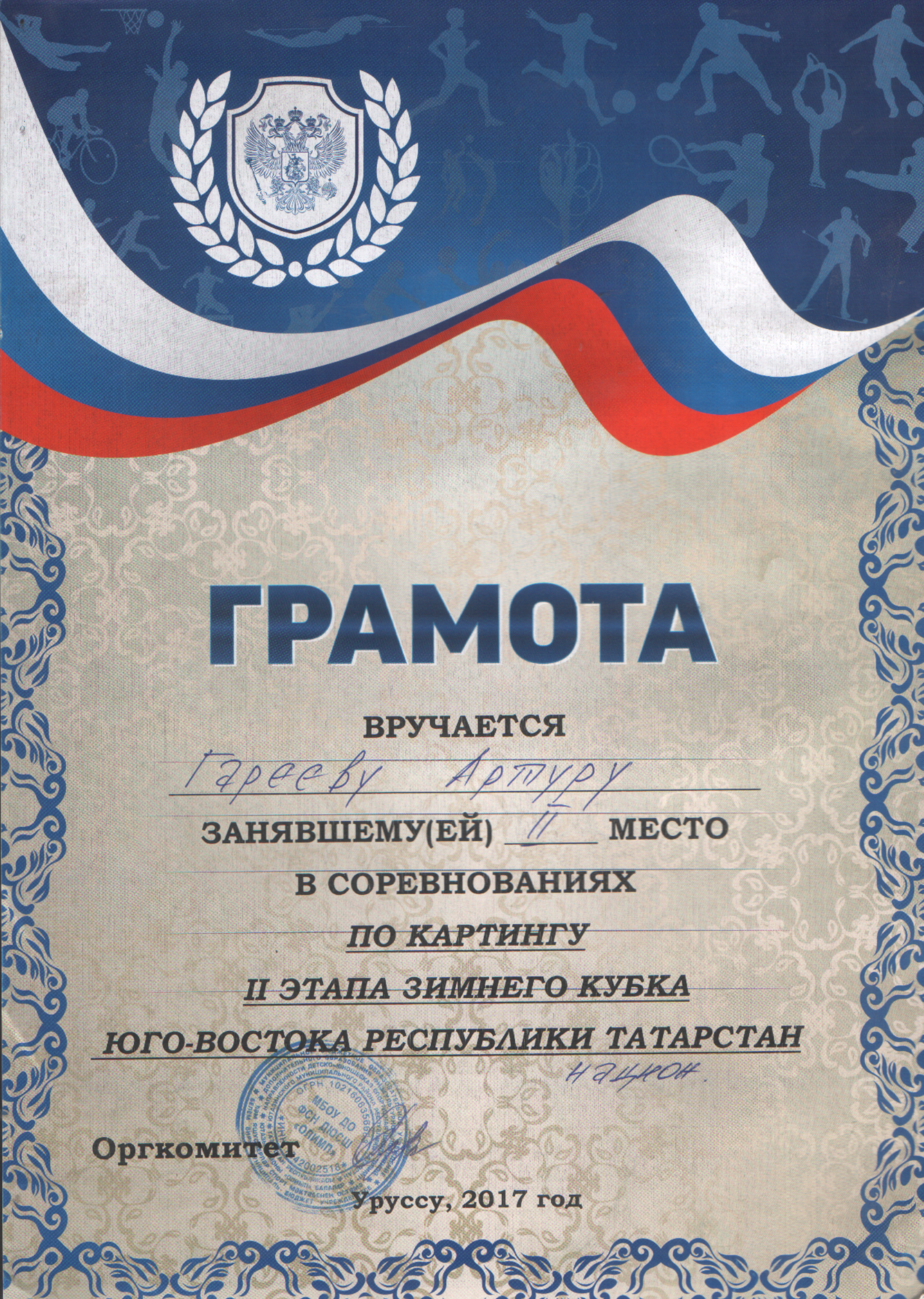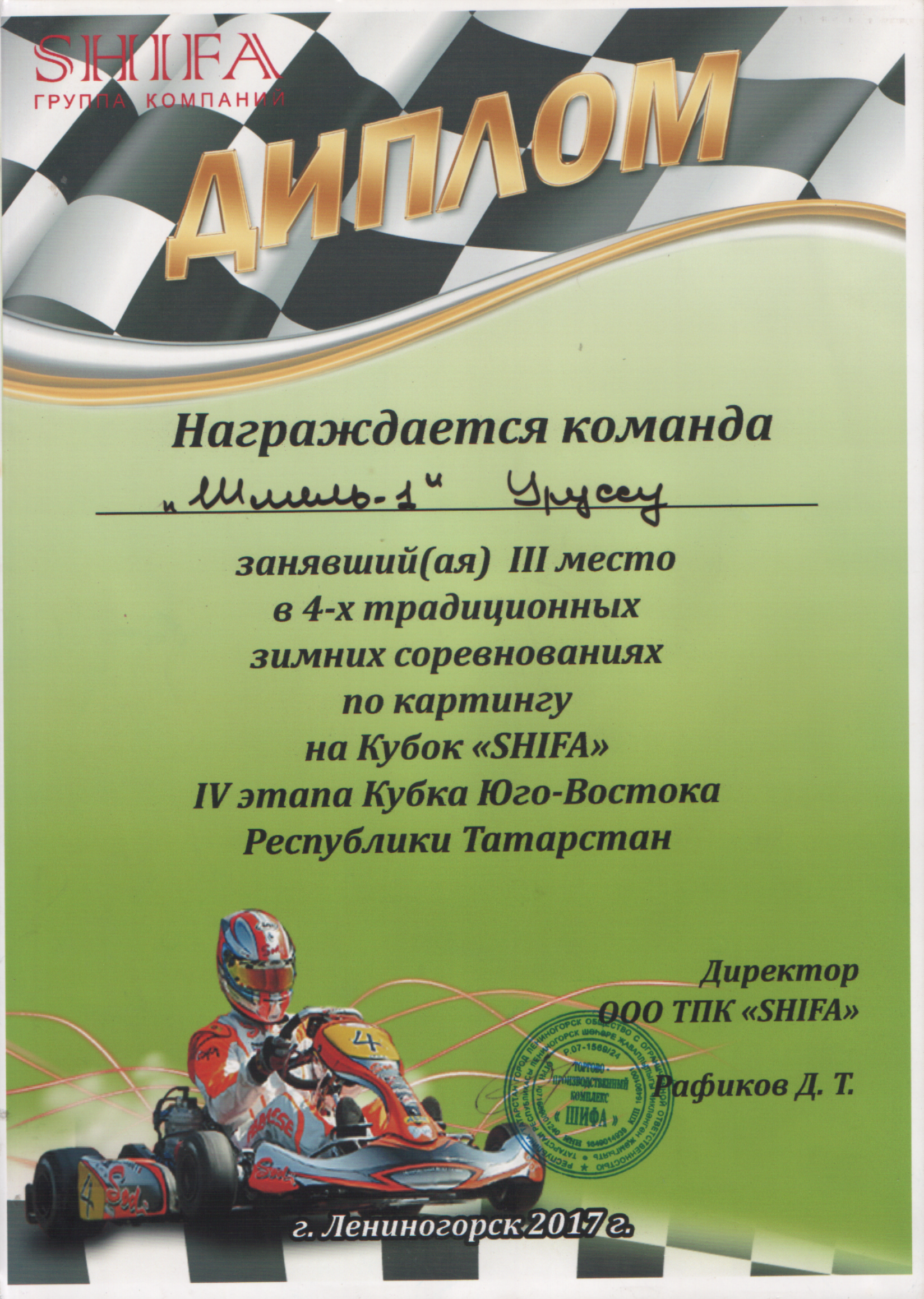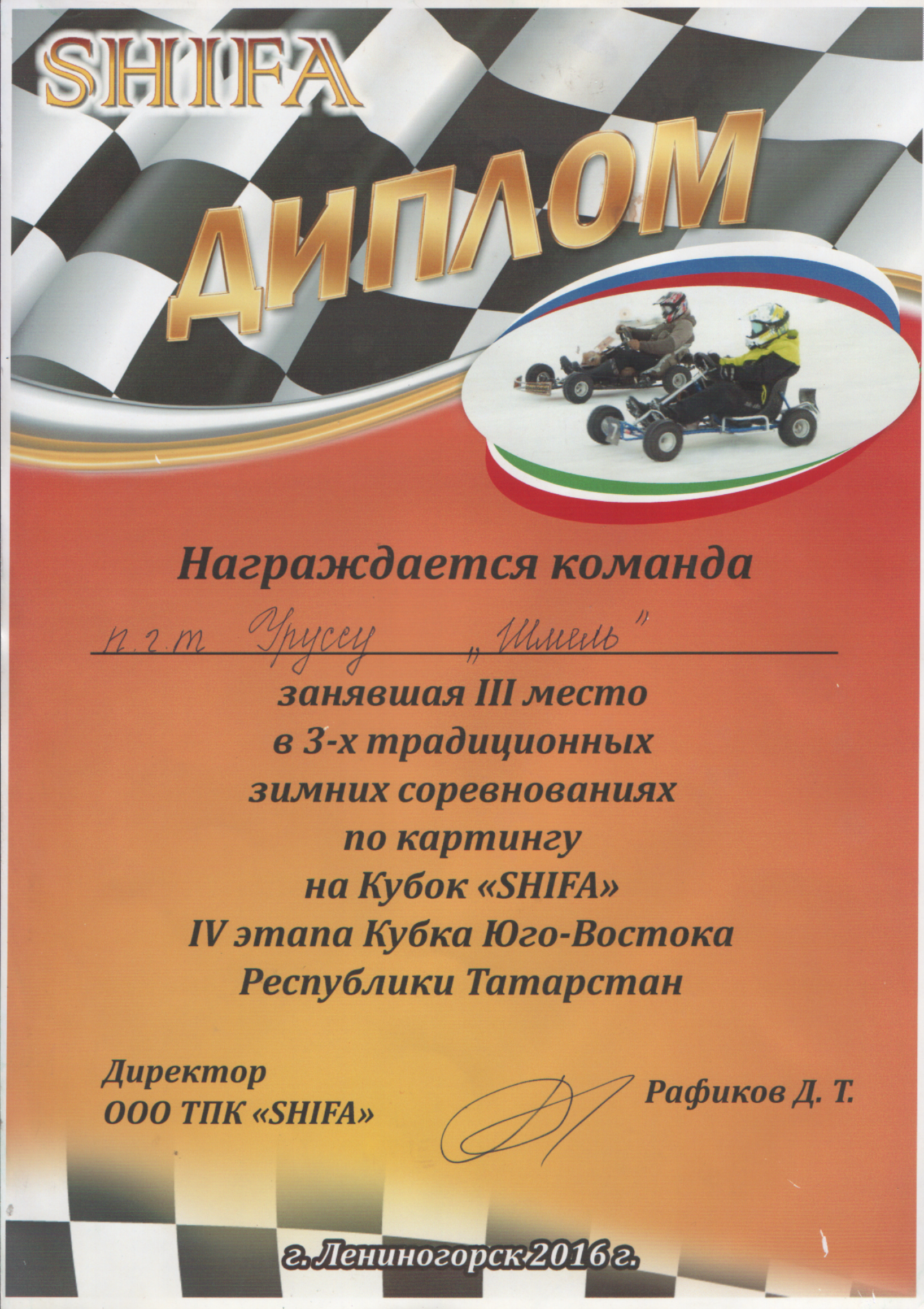 /Диплом 3 степени в зимних соревнованиях по картингу на кубок "Шифа". Хуснутдинов Марат.bmp