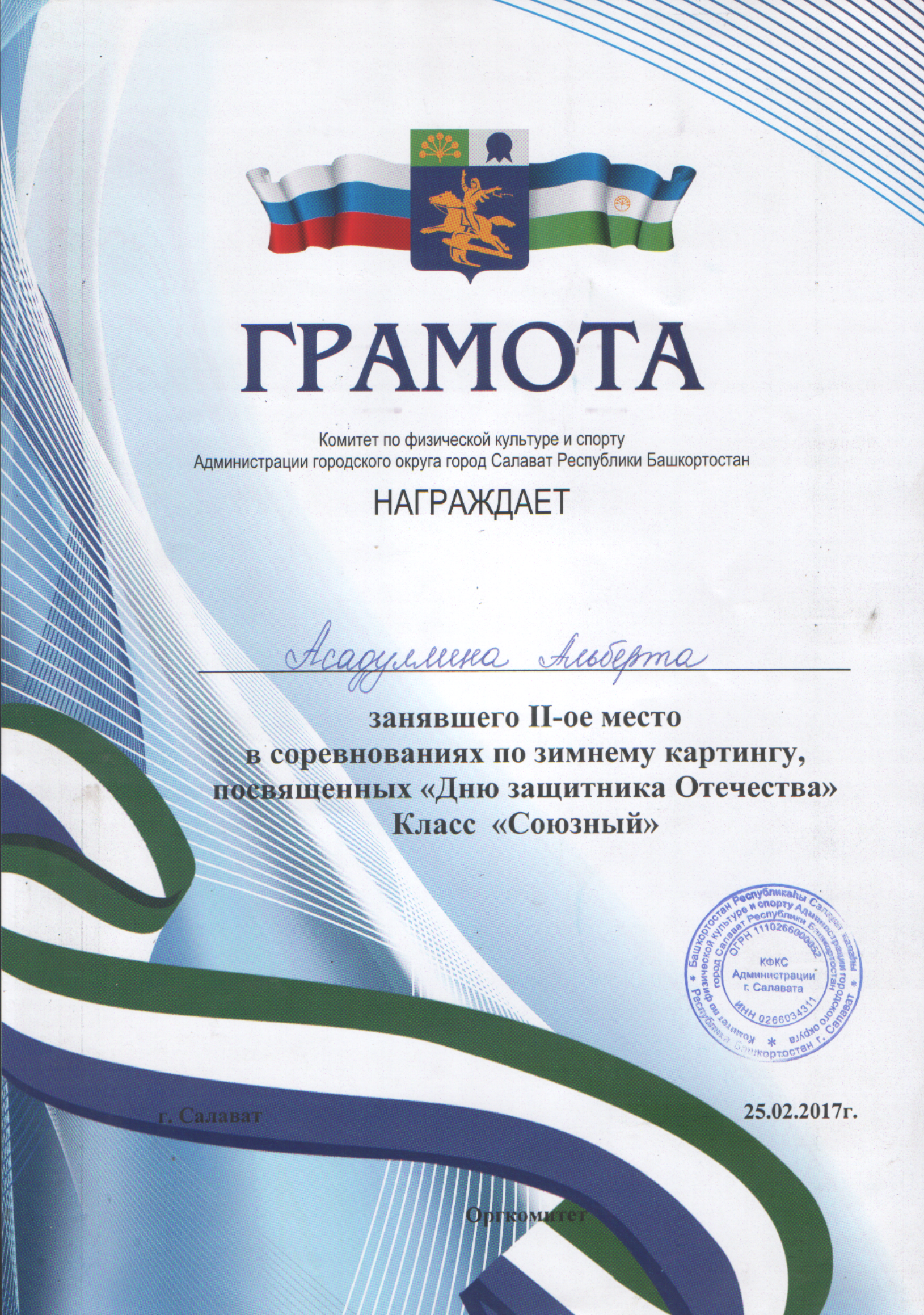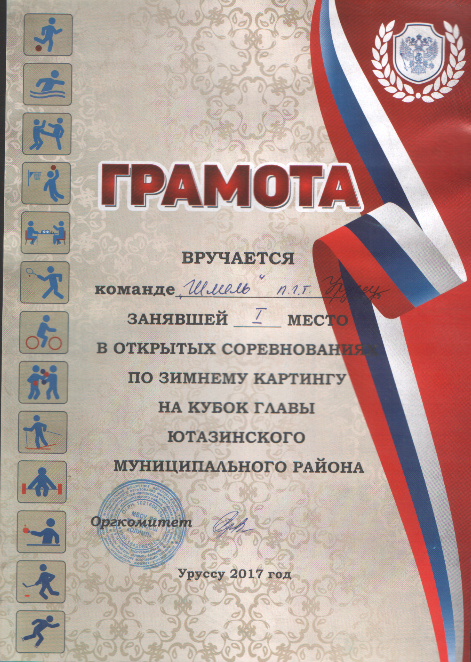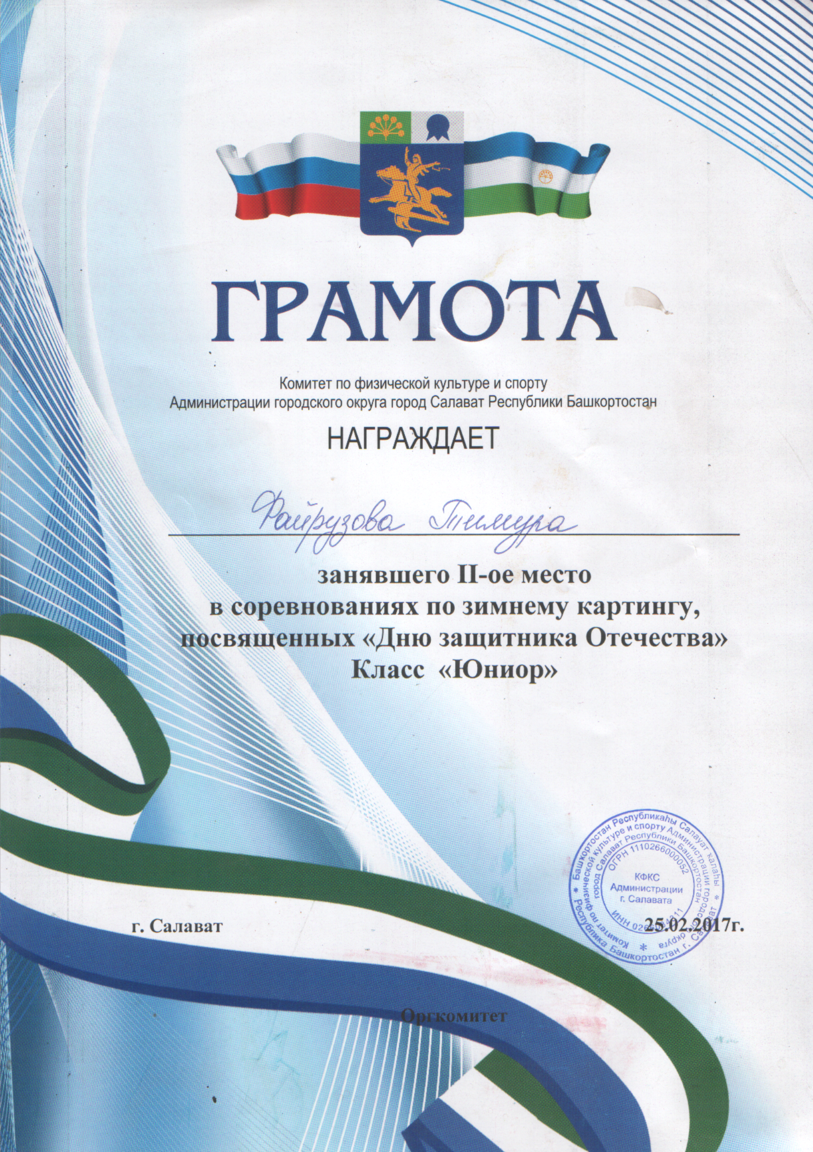 /Диплом 3 степени в зимних соревнованиях по картингу на кубок "Шифа". Хуснутдинов Марат.bmp