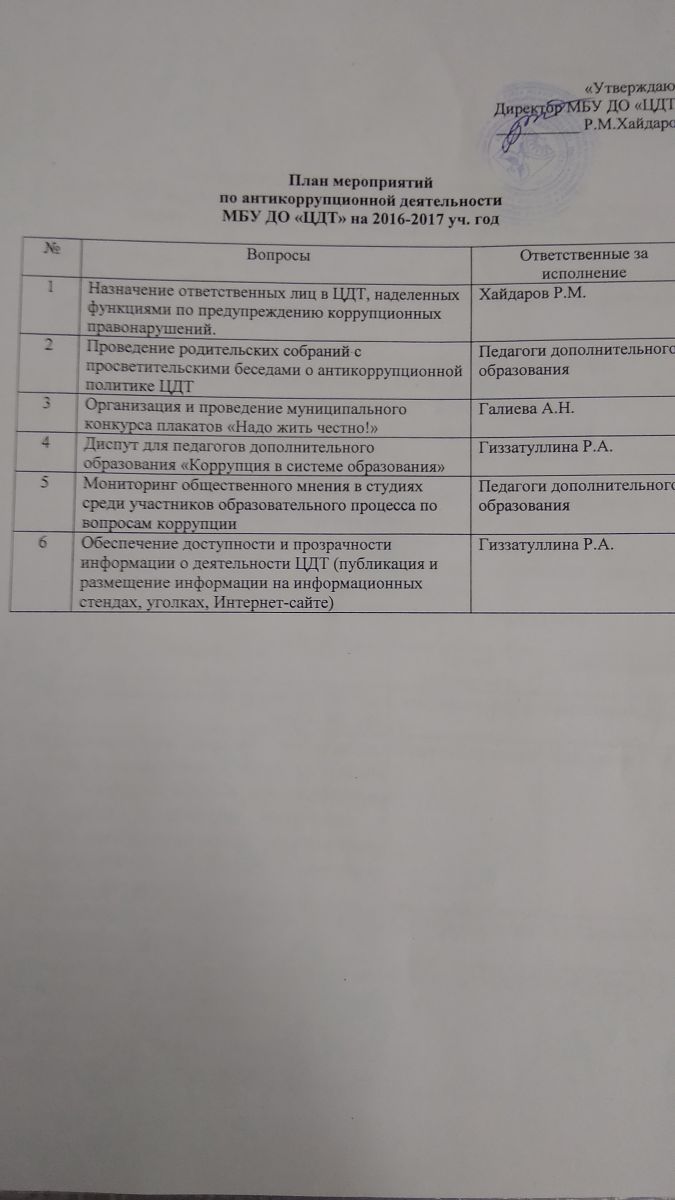 План мероприятий по антикоррупционной деятельности МБУ ДО «ЦДТ» на 2016-2017 уч. год