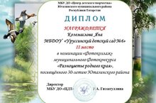 Награждение Дипломом 2 степени, воспитанницы старшей - подготовительной группы детского сада Коземасловой Яны за участие в конкурсе "Разноцветные цветы родного края" посвященного 30 - летию Ютазинского района / Ютазы районының 30 еллыгына багышланган “Туган якның төрле төстәге чәчәкләре” конкурсында катнашкан өчен өлкән балалар бакчасында тәрбияләнүче Коземаслова Янаны 2 дәрәҗә диплом белән бүләкләү 08.02.2021