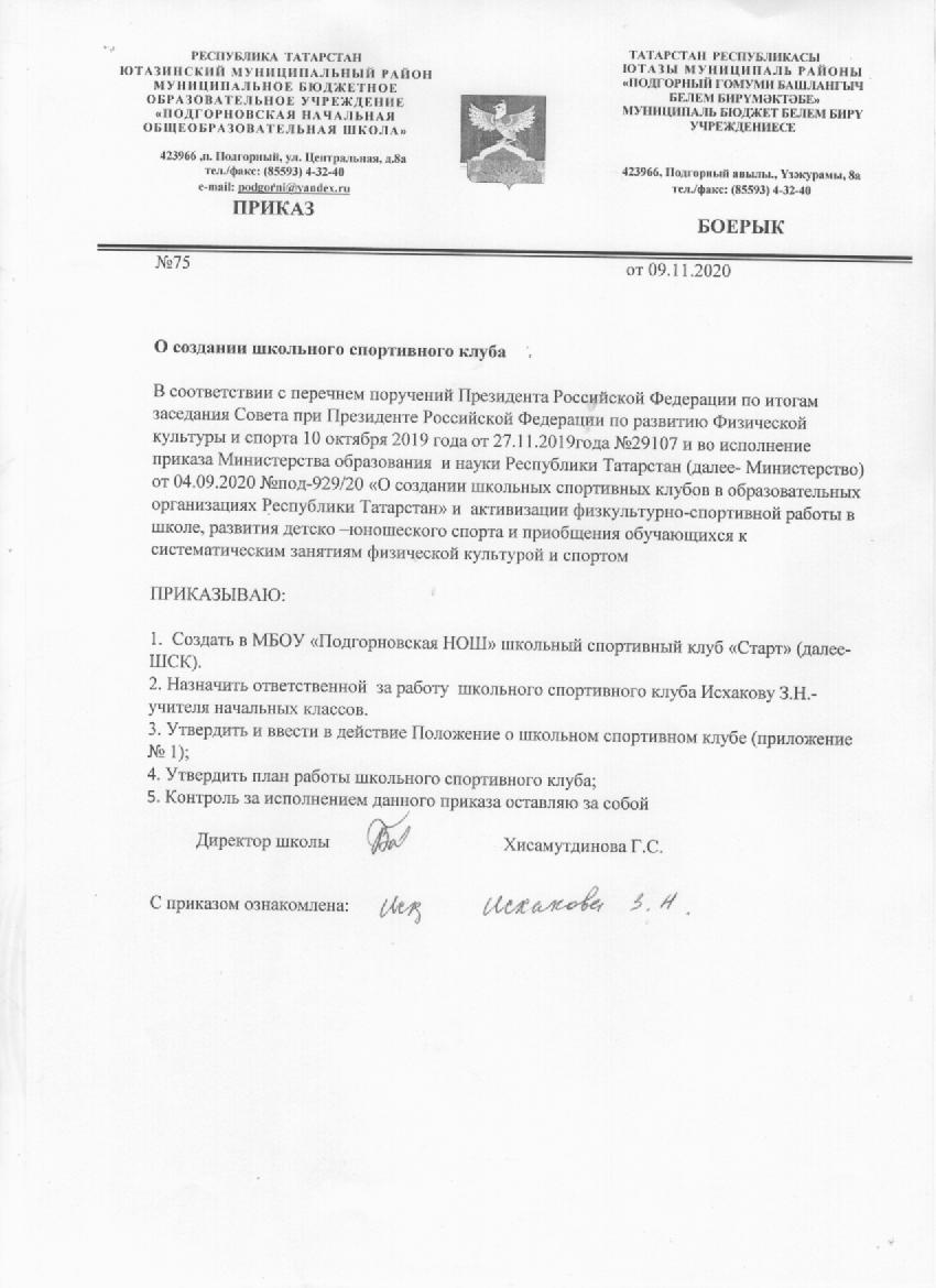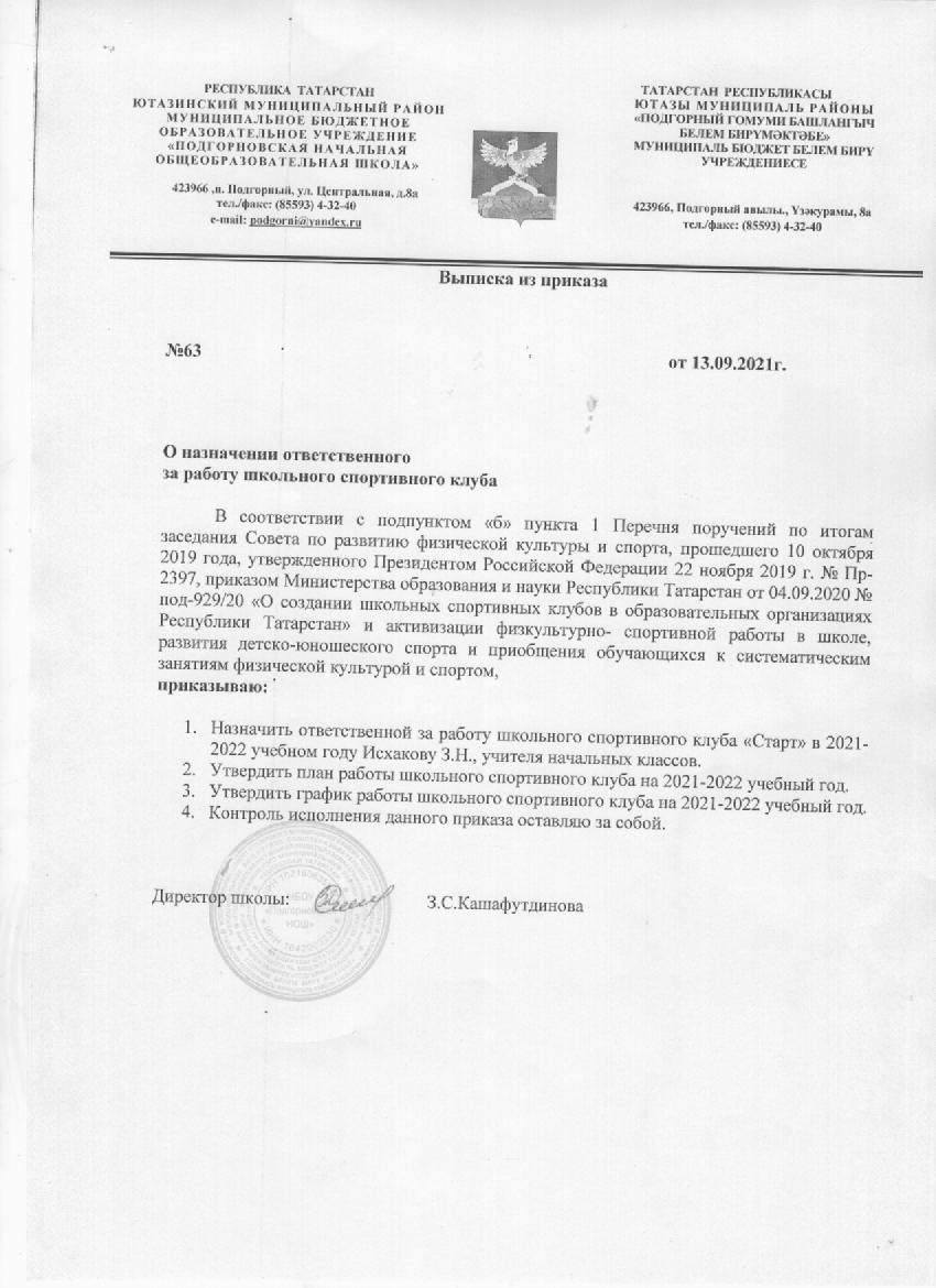Приказ о назначении ответственного за работу ШСК в 2021-2022 у.г.