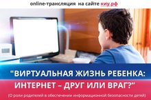 19 января с 12.00 по 13.30 на сайте киу.рф пройдет Республиканское родительское Интернет-собрание по теме: "Виртуальная жизнь ребенка: Интернет друг или враг?( о роли родителей в обеспечении информационной безопасности детей)" Задайте вопрос по адресу: roditelirt@mail.ru.
