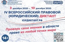 С 3 по 10 декабря 2020 года в целях оценки уровня правовой грамотности населения пройдет Четвертый Всероссийский правовой (юридический) диктант. Соорганизаторами Диктанта выступают Общероссийская общественная организация «Ассоциация юристов России» и Общероссийская общественная организация «Деловая Россия» при поддержке Федерального государственного бюджетного образовательного учреждения высшего образования «Московский государственный юридический университет имени О.Е. Кутафина».