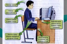 Рабочее место школьника рекомендуется располагать у окна для достаточного естественного освещения (для ребенка правши стол необходимо расположить слева от окна, для ребенка левши-справа).Даже при наличии хорошего верхнего освещения и естественного источника свет (окна), на столе необходима настольная лампа. Чтобы тени не мешали, лампу для ребенка правши нужно поставить на столе слева, для ребенка левши – справа.Если на рабочем столе школьника установлен компьютер, то монитор должен находиться прямо перед глазами (чтобы ребенку не приходилось поворачиваться к нему). Экран видеомонитора должен находиться от глаз пользователя на расстоянии 600-700 мм.Книги желательно ставить на подставку на расстоянии вытянутой руки от глаз. Это позволяет ребенку держать голову прямо (снимает нагрузку на шейный отдел) и предотвращает развитие близорукости.Необходимо сохранять во время учебных занятий правильную рабочую позу, которая наименее утомительна: сидеть глубоко на стуле, ровно держать корпус и голову; ноги должны быть согнуты в тазобедренном и коленном суставах, ступни опираться на пол, предплечья свободно лежать на столе.Стул задвигается под стол так, чтобы при опоре на спинку между грудью и столом помещалась его ладонь.Нельзя опираться грудью о край парты (стола); расстояние от глаз до книги или тетради должно равняться длине предплечья от локтя до конца пальцев. Руки лежать свободно, не прижимаясь к столу, на тетради лежит правая рука и пальцы левой. Обе ноги всей ступней опираются на пол. Если ребенок пишет, то опирается о спинку стула поясницей, при чтении материала сидит более свободно, опирается о спинку стула не только крестцовопоясничной, но и подлопаточной частью спины.Через каждые 30-45 минут занятий следует вставать и подвигаться 10 минут. Мебель должна соответствовать росту ребенка. Рекомендуется мебель с меняющимися параметрами, чтобы была возможность увеличить высоту столешницы или сиденья в соответствии с ростом школьника -