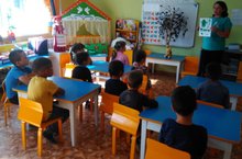 Тәрбияче НасыйроваГөлнур Шатовна балаларга глобусның Җир шары моделе булуын сөйләде. Безнең планета космостан шулай күренә. Җирдә су күп өлешен алып тора, планетабызны зәңгәр төскә кертә. Су планетабыз өслегенең дүрттән өч өлешен алып тора.